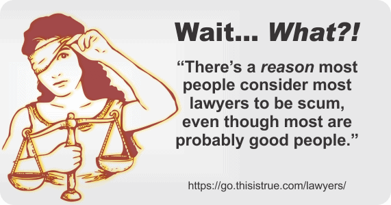An illustration of Lady Justice holding scales and lifting her blindfold is beside the text: Wait... What?! 'There’s a reason most people consider most lawyers to be scum, even though most are probably good people.'