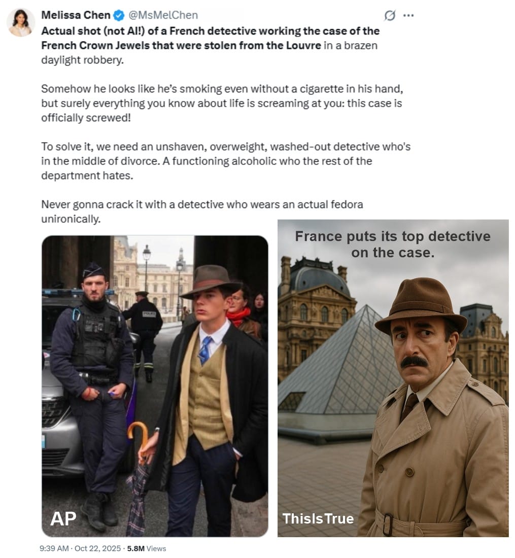The daring daylight theft of 88 million euros (US$102 million) worth of crown jewels from the Louvre in Paris, France, has sparked imaginations worldwide. An Associated Press photographer at the scene snapped a shot of police at the museum which reveals a very dapper young man with a thin moustache, dressed in a suit and tie, fedora, and thigh-length trench coat, and carrying an umbrella. Online wags suggested, “Inspector Clouseau?”, the fictional bumbling-yet-successful French police detective played by the late Peter Sellers. When the AP inquired of the Paris Prosecutor’s office who the man really is, they replied, “We’d rather keep the mystery alive ;)”. About the same time as the photo was released over the AP wires, This is True posted a gag A.I.-generated photo of Peter Sellers dressed as Clouseau in front of the Louvre with the caption, “France puts its top detective on the case.” The man is apparently just a passerby, not a detective. (RC/AP)…Art imitating farce.