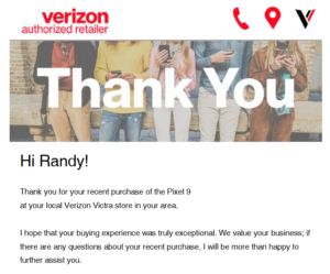 The next email: “Thank you for choosing Verizon for your recent purchase!” My eyebrow goes up. Sure enough, they bought a cell phone! So much for “absolutely no activity” on my account! Well, sort of.