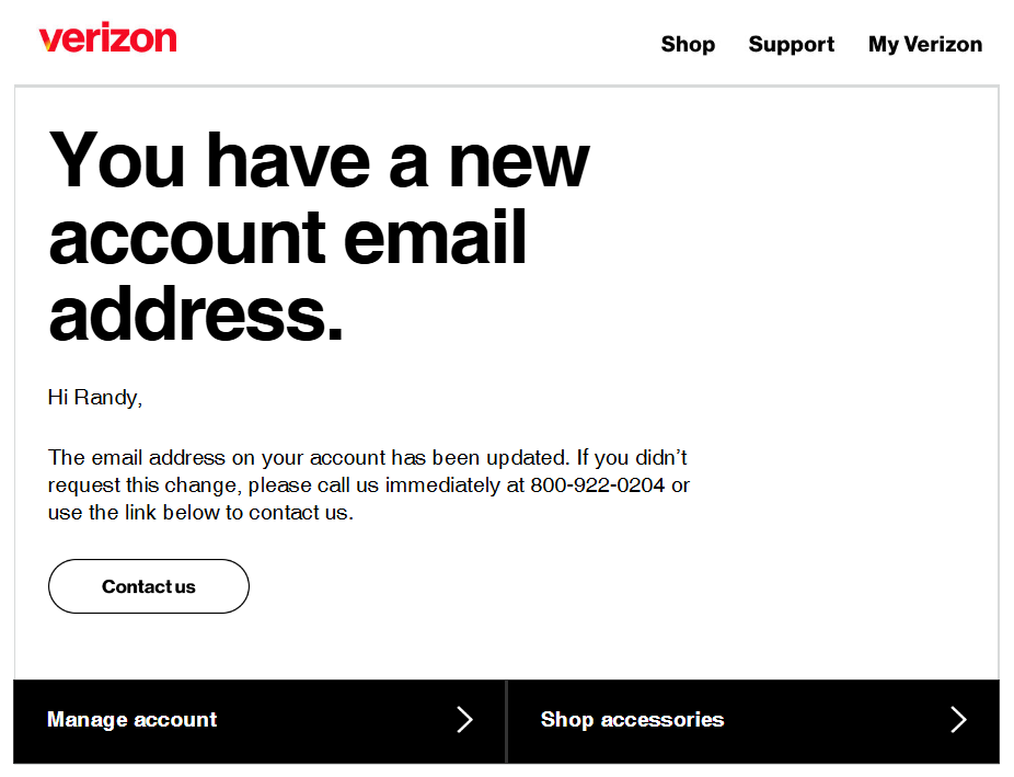 Today I got a security alert from Verizon: my account email had been changed. That’s of course quite concerning! Is someone trying to take over my account and charge, say, a cell phone to my account? It’s a concern even though I closed that account last year when I ported my phone number away from VZW to a different carrier — they had my credit card info stored there.