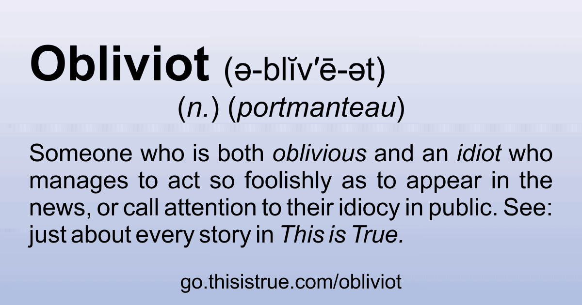 “Obliviot” is a shorthand term for the sort of person who tends to be featured in This is True. Some ask what it means(!), and others wonder where it came from. This page has the answers.
