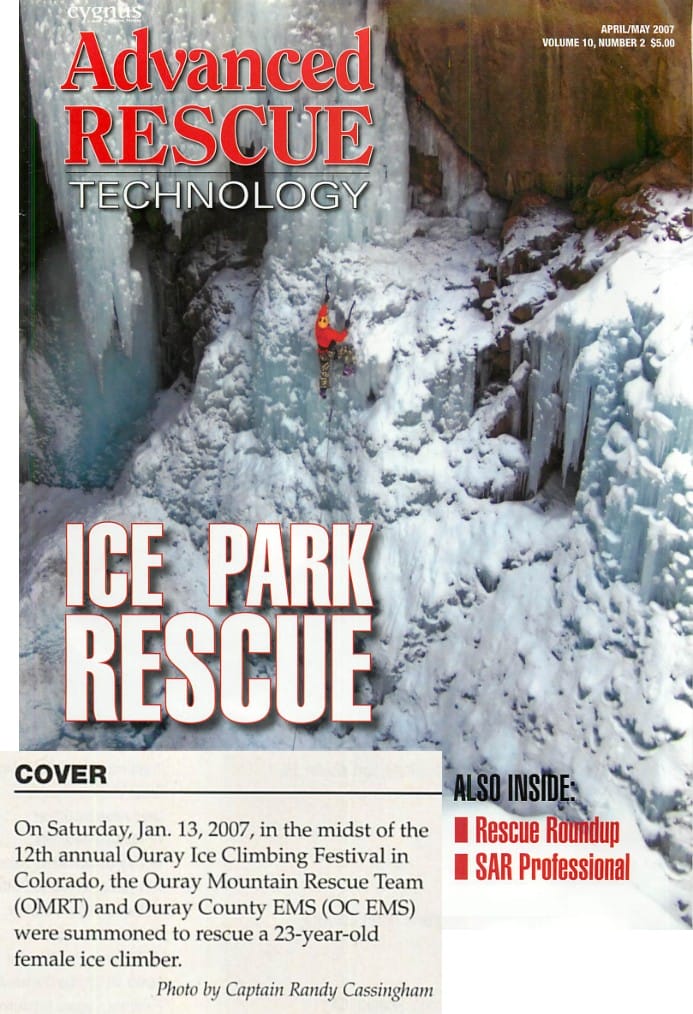 The cover of 'Advanced Rescue Technology' magazine dated April/May 2007. The cover is dominated by a photo of a person wearing red climbing an icy, snow-covered vertical canyon wall in a winter landscape, with others watching below. Text overlays read “ICE PARK RESCUE” and mention an ice climbing rescue event.