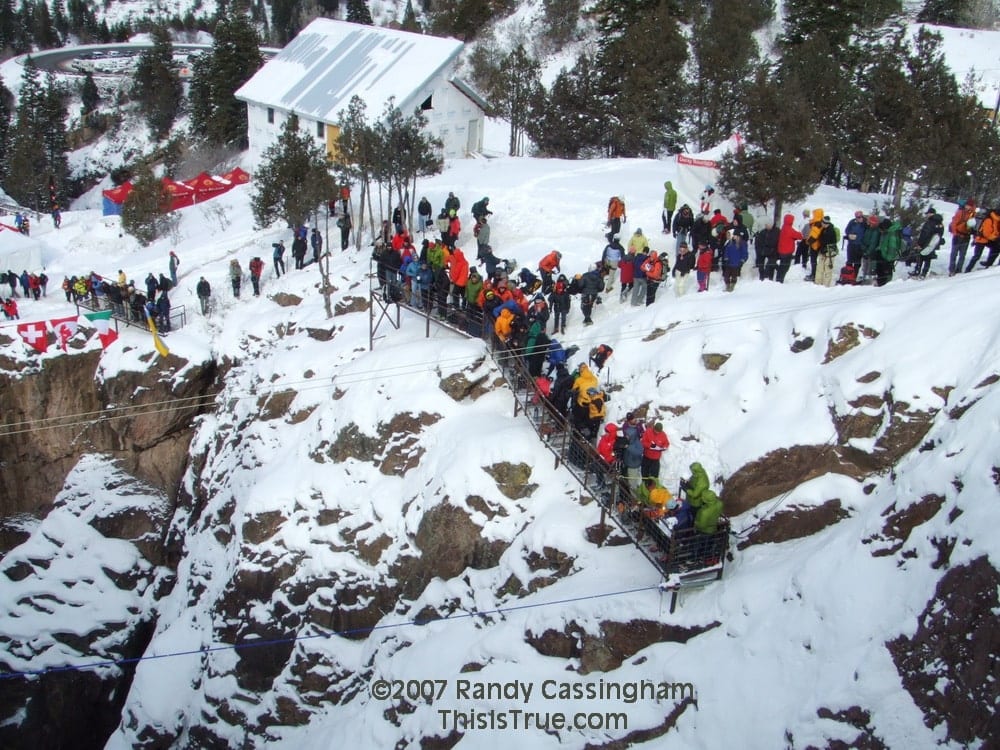 A crowd in winter clothing gathers on a snowy cliff and a narrow bridge spanning a deep gorge. Snow covers the ground, and pine trees and buildings are visible in the background.