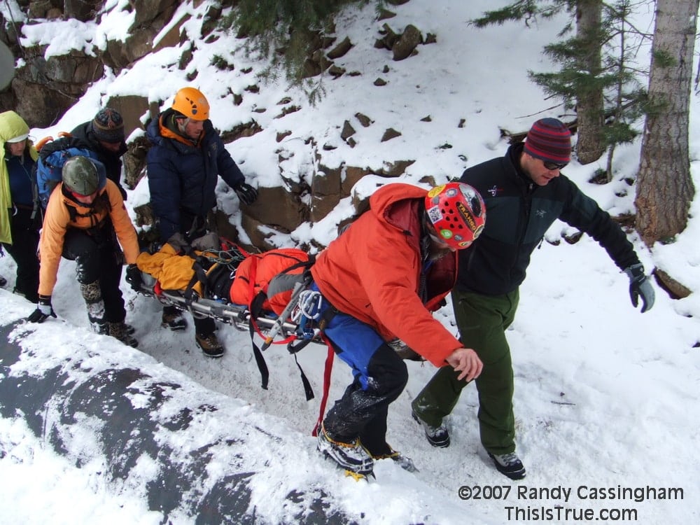 In the photo where they are hauling the injured climber along the top the climber with the red jacket is running a significant risk of his helmet failing structually as he has numerous “stickers” attached to it – the solvents in the adhesive are known to chemically attack the plastic and causing it to fracture on impact.