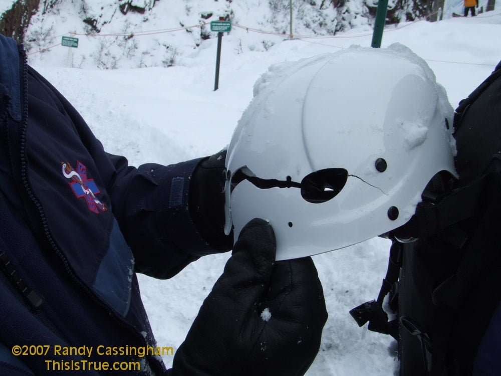 A person holds a white helmet with a large, jagged crack down the middle, showing snow on it. The background is snowy, and the person wears a blue jacket with an EMS logo.