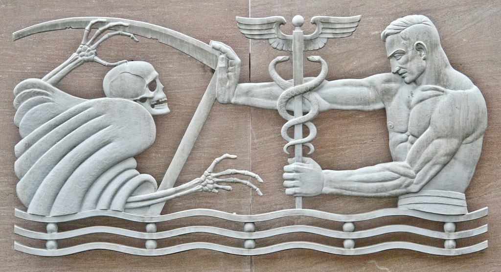 That’s Asclepius, the Greek god of healing. Note that he’s not holding a caduceus — a rod with wings with two snakes wound around it — to fend off Death. The caduceus is the symbol carried in the left hand of Mercury, the messenger of the gods — and guide of the dead and protector of merchants, shepherds, gamblers, liars, and thieves. It was mistakenly adopted as the symbol of medicine by the U.S. Army Medical Corps in 1902 at the insistence of a single officer.