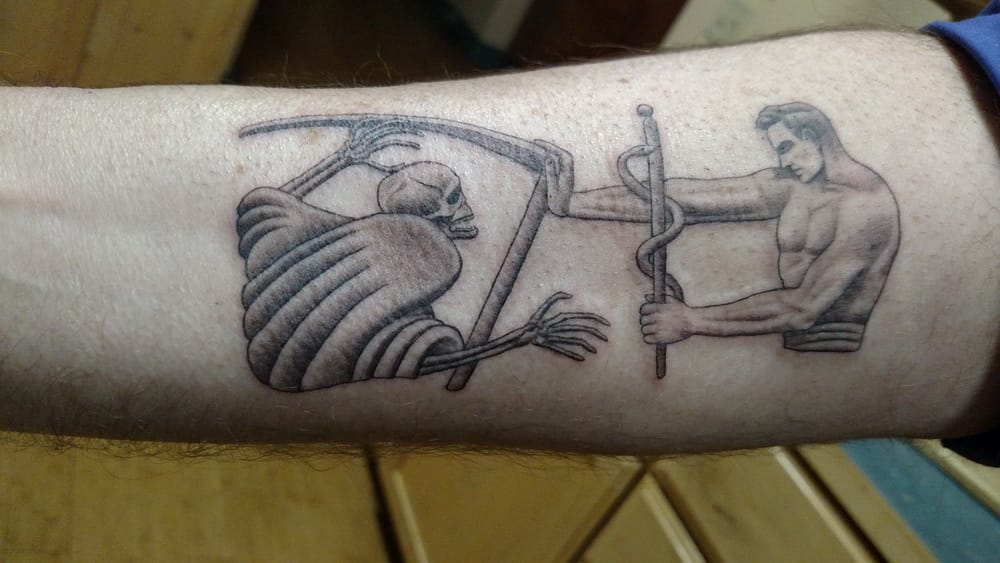 Right forearm "black and gray" tattoo of a medic fighting off death: the man holding the classic skeletal image of death with his scythe, and the man holding the Rod of Asclepius.