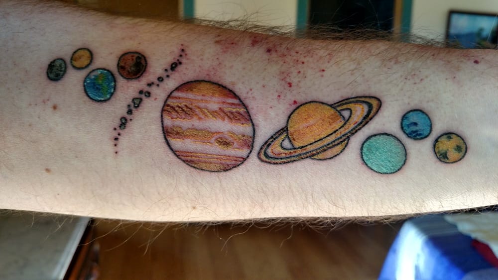 Left forearm full-color tattoo of the solar system (including the asteroid belt) of all 9 planets.