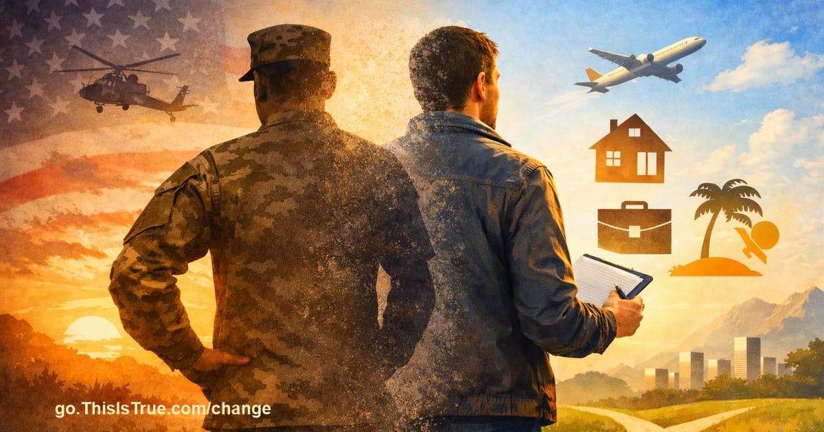 A man in two scenes: first in military uniform facing a helicopter flying at sunset, and second in civilian clothes holding a clipboard facing icons of a house, suitcase, airplane, and beach, symbolizing life transitions.