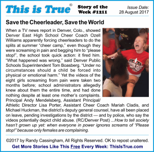 I’m not going to read the story to you — you can find it on the Show Page — but you’ll get the idea. Apparently, East High School in Denver, Colorado, is known for its cheerleading squad. KUSA TV news in Denver was given some videos taken at the school’s Cheer Camp in June 2017. The eight videos show multiple cheerleaders being pushed — verbally and physically forced — to do splits, and every one of them is screaming in pain and asking the coaches to stop.