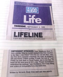 The next morning, his web host called to ask him what the hell he did, because he was getting so much traffic their servers were crashing under the load. It turned out, since his story about hawking the funny Titanic T-shirts tied in with what was already in the news, USA Today ran their blurb about his little stunt on the front page of its “Life” section, and just like the tourists on Times Square, amused newspaper readers wanted a T-shirt! Over the next several months he sold thousands of shirts, clearing (after printing, shipping, and all) around $100,000 — which was plenty to start his New York City PR agency and, of course, the agency was able to start life with a great story of an extremely successful PR stunt. You can see the newspaper clip on the Show Page.