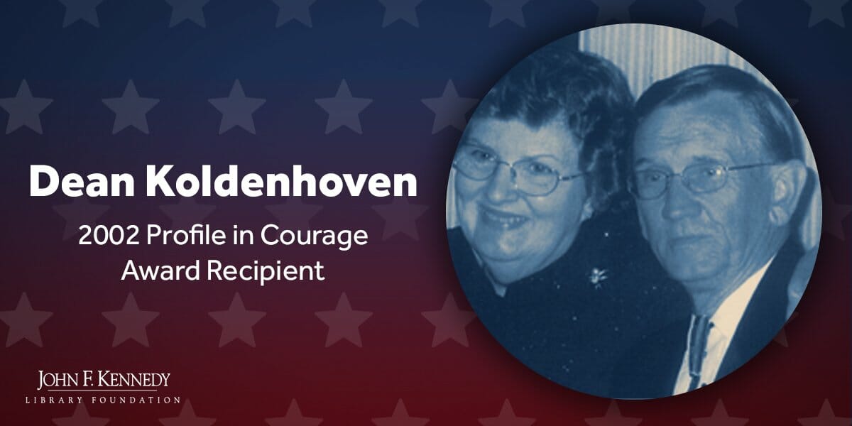 A photo of Dean Koldenhoven with his wife, beside text reading: “Dean Koldenhoven, 2002 Profile in Courage Award Recipient.” Background features star patterns and the John F. Kennedy Library Foundation logo.The first is pretty straightforward; virtually everyone understood that I was praising the mayor, and lecturing the city council (hey, morons: “Freedom of Religion” applies to everyone, not just you idiotic public servants”!)