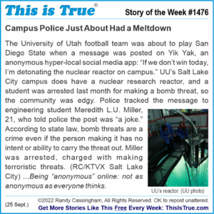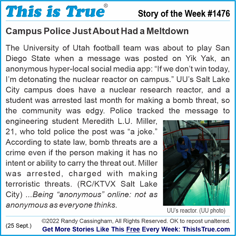 The University of Utah football team was about to play San Diego State when a message was posted on Yik Yak, an anonymous hyper-local social media app: “If we don’t win today, I’m detonating the nuclear reactor on campus.” UU’s Salt Lake City campus does have a nuclear research reactor, and a student was arrested last month for making a bomb threat, so the community was edgy. Police tracked the message to engineering student Meredith L.U. Miller, 21, who told police the post was “a joke.” According to state law, bomb threats are a crime even if the person making it has no intent or ability to carry the threat out. Miller was arrested, charged with making terroristic threats. (RC/KTVX Salt Lake City) …Being “anonymous” online: not as anonymous as everyone thinks.