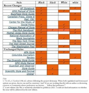 America is still pretty darned racist — the story above is but one example of that. So it’s not surprising that newspaper style was lower-case “black” (in reference to people) for many years. AP announced the change in June 2020 — and the next month clarified that white would not change.
