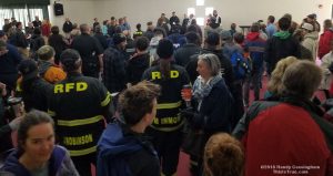 The morning briefing, before the exercise began. I couldn’t get a shot wide enough to get everyone in: medics, firefighters, cops, special rescue, and dozens of other volunteers taking time out of their weekend to learn, and test the system. (My photo. Click to see larger.)