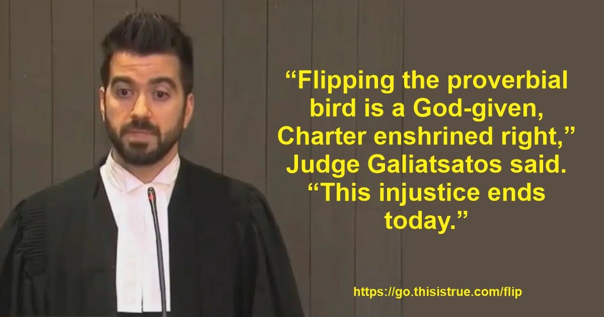“To be abundantly clear, it is not a crime to give someone the finger,” scolded Judge Dennis Galiatsatos of the Court of Quebec, Canada, in a 26-page ruling. “Flipping the proverbial bird is a God-given, Charter enshrined right that belongs to every red-blooded Canadian,” he continued. “The complainants are free to clutch their pearls in the face of such an insult. However, the police department and the 9-1-1 dispatching service have more important priorities to address.” With that, “This injustice ends today,” he ruled, throwing out the criminal case against Neall Epstein, instigated by his neighbor, Michael Naccache, 34, who repeatedly called police on Epstein, calling the gesture “threatening.” Epstein was arrested and prosecuted for “criminal harassment and uttering death threats,” the judge observed. Galiatsatos further lectured that Naccache “consistently videotaped their neighbours,” and provided video “evidence” to the court showing the problem — including Naccache and his wife driving “dangerously near the [Epstein’s] children as a way to protest their presence.” Then, “With an irony of unmatched proportions, they complain that [Epstein] might have recorded them. He did not.” Prof. Andrew McDougall of the University of Toronto, an expert in constitutional law, commented that “If all the person did was simply put up the middle finger, it would be hard to read [it] as a threat.” (RC/Toronto Star) …Unless Naccache is willing to go on record as believing it was loaded.