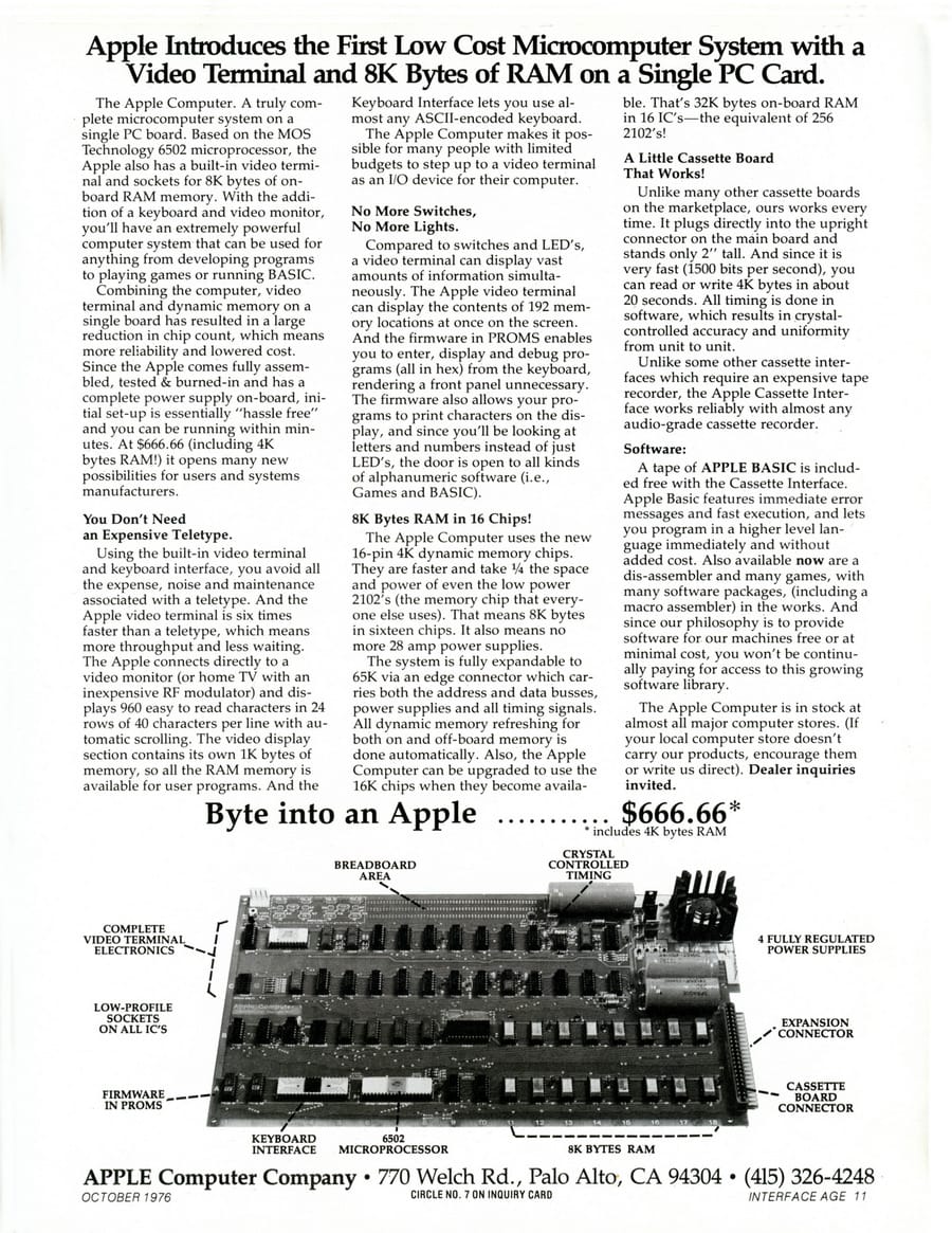 That’s why the 6502, at just $35 (actually $25, the equivalent of $145 today; the two printed manuals were $5 each), was so exciting: it was simpler, faster, and cheaper than the 6800, and Woz wanted one bad. This crucial moment Dan speaks of is when Woz first got his hands on a couple of them, allowing the breadboarding design of the Apple-1 to proceed. Dan was the one who got them for Woz.