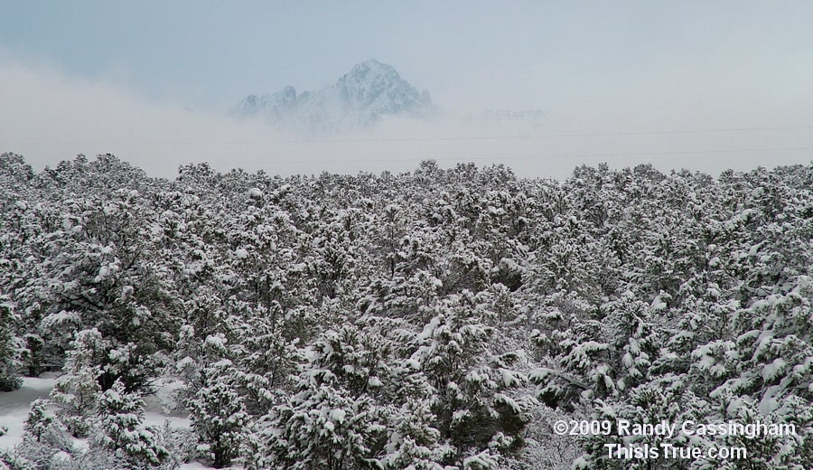 We had that slow-plopping, wet, heavy snow here last week–had to time your exit from the house to avoid getting plopped on. It was quite beautiful on our blue spruce, but lacked that certain something without the mountains in the background.
