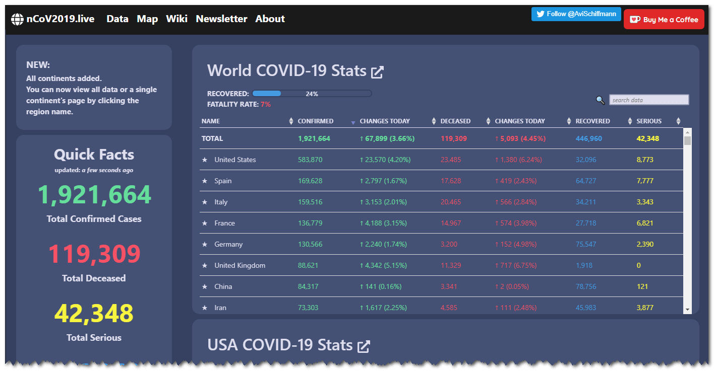 Meanwhile, to my suspicion of China “under-reporting” their numbers: today (April 17), CNBC reported that China’s official news agency “has revised upwards the numbers of confirmed coronavirus cases and deaths” in Wuhan, the city of origin of the virus, after “a city-wide investigation.” While infections only went up by 325 (to 50,333 cases), deaths jumped by 1,290 (to 3,869). My gut feeling is the numbers are still under-reported. (Source)