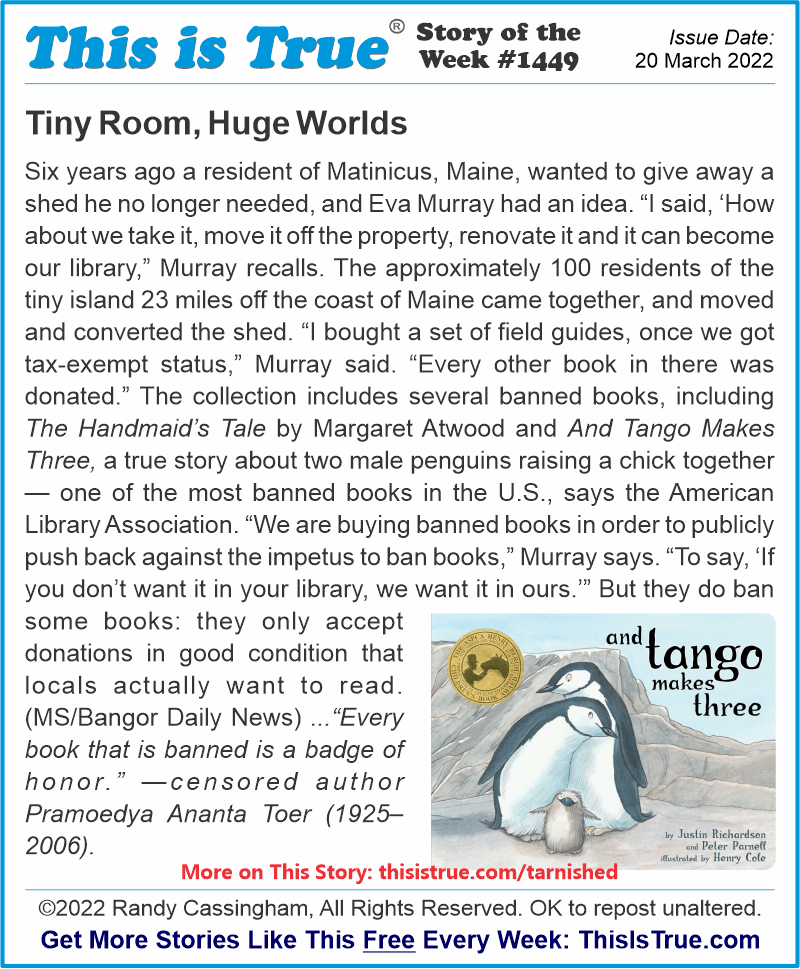 This week one of the articles I covered was about the Matinicus Island Library, and how this tiny library in a tiny Maine community is bringing banned books to its residents — because they want to read them.