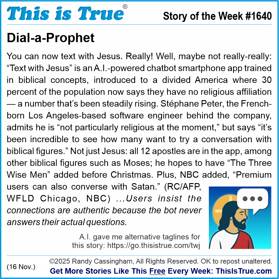 You can now text with Jesus. Really! Well, maybe not really-really: “Text with Jesus” is an A.I.-powered chatbot smartphone app trained in biblical concepts, introduced to a divided America where 30 percent of the population now says they have no religious affiliation — a number that’s been steadily rising. Stéphane Peter, the French-born Los Angeles-based software engineer behind the company, admits he is “not particularly religious at the moment,” but says “it’s been incredible to see how many want to try a conversation with biblical figures.” Not just Jesus: all 12 apostles are in the app, among other biblical figures such as Moses; he hopes to have “The Three Wise Men” added before Christmas. Plus, NBC added, “Premium users can also converse with Satan.” (RC/AFP, WFLD Chicago, NBC) …Users insist the connections are authentic because the bot never answers their actual questions.