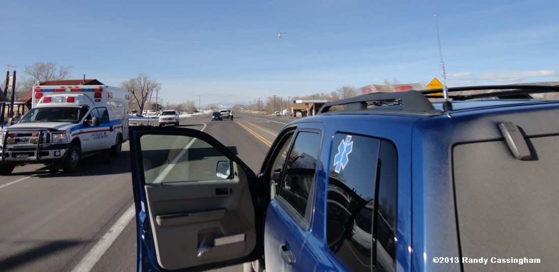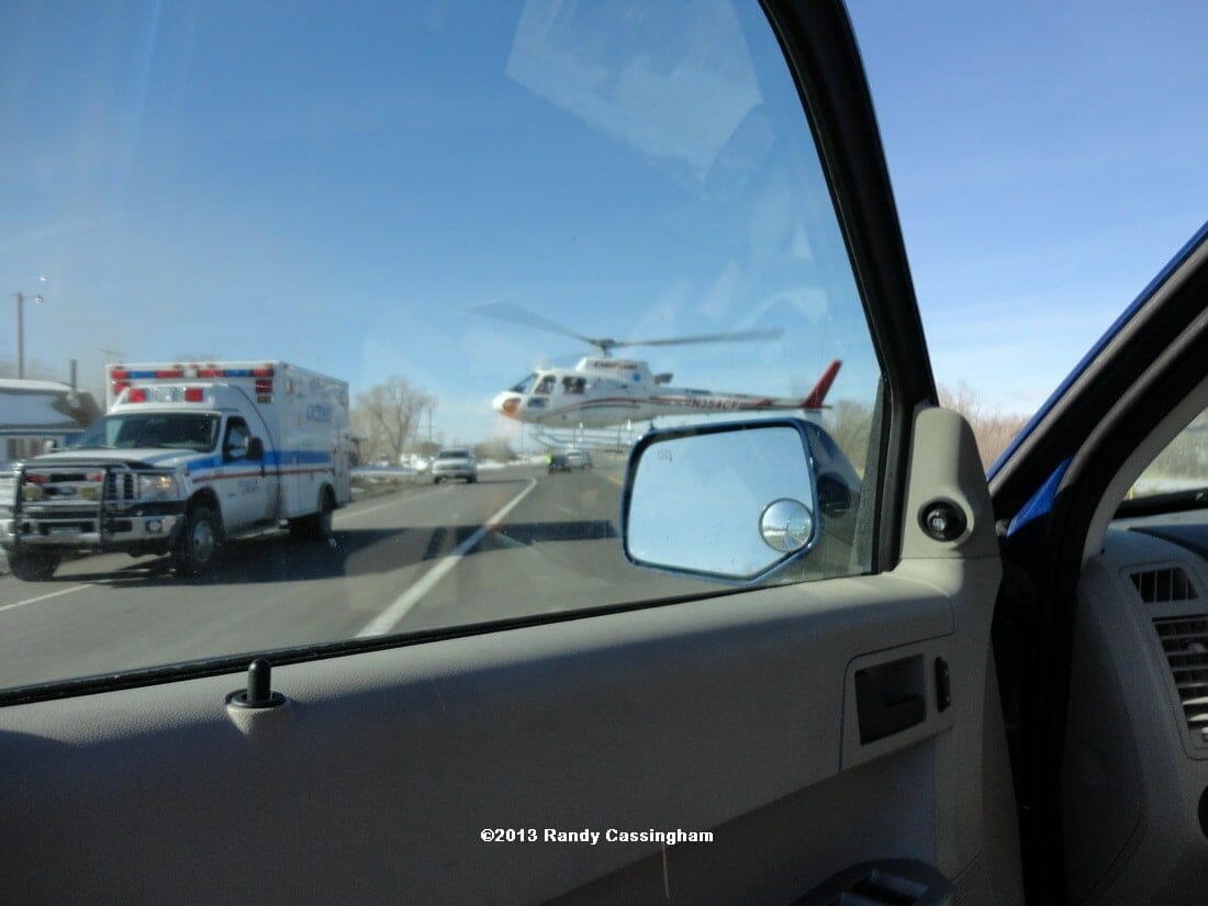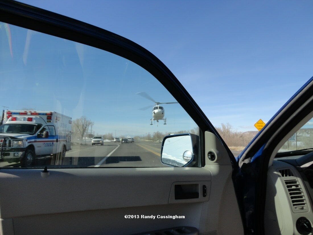 The ambulance arrived first; I had them park behind me. I called for the chopper on FERN, and found they were a minute out. Rich, another First Responder who heard the call, arrived, and I sent him to the south end to close the road immediately. He pulled over and jumped out to stop traffic as I pulled my car around to stop the other direction. The sheriff’s deputy arrived to reinforce Rich’s position.