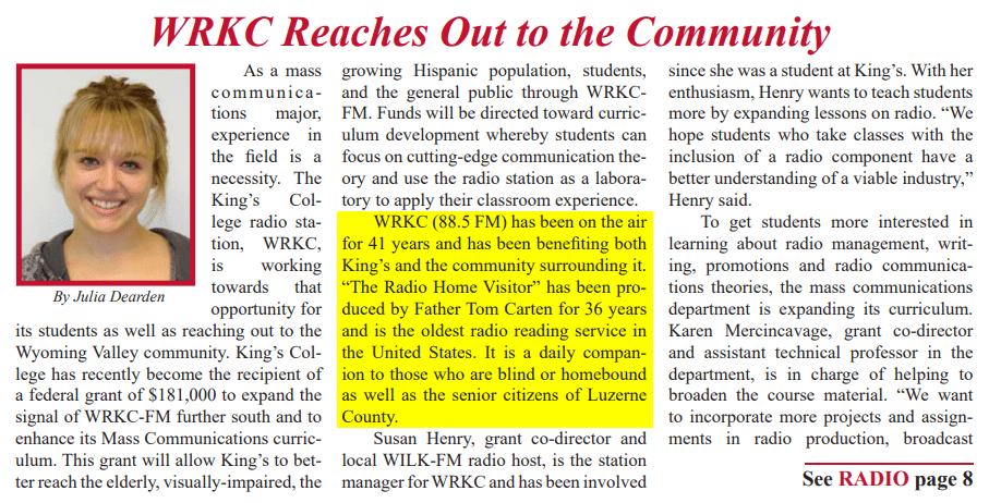 At the time he was a professor at Kings College in Wilkes Barre, Penn., but soon retired. King’s College was founded in 1946 by CHC priests, as well as brothers from the University of Notre Dame. Tom founded “The Radio Home Visitor” show at the campus radio station, WRKC, in 1974: it still runs today, and is the oldest radio reading service for the blind in the U.S.