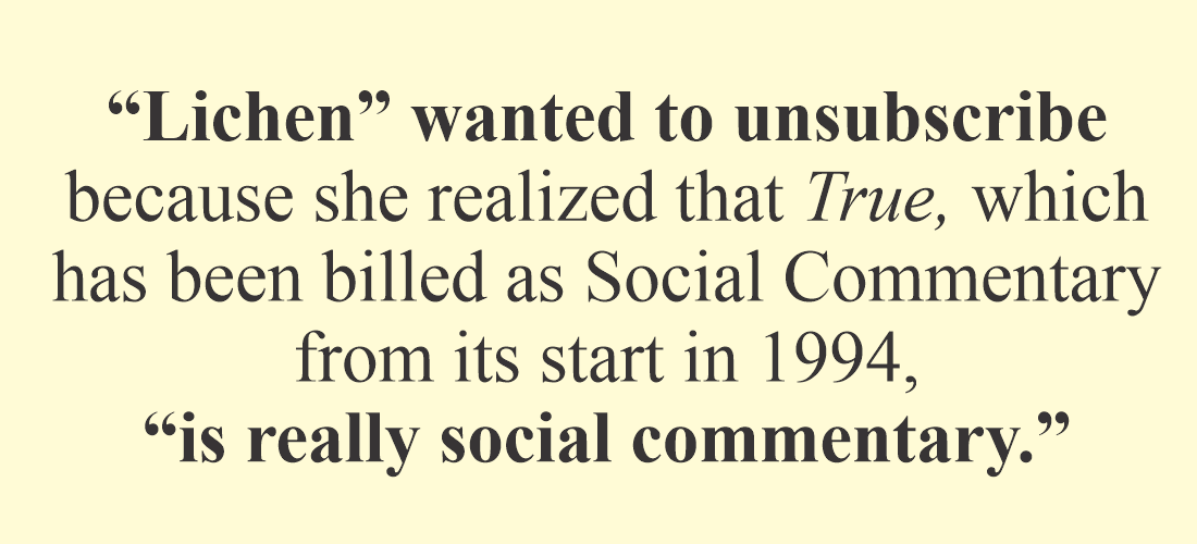 This is True has always been social commentary. Since Issue 1 in 1994. I don’t think Lichen was a subscriber that long ago, so I’m not sure what she is comparing it to, but I’m not trying to be like other publications in any case.