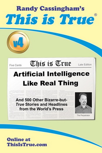 The all-new books for Kindle (and other ebook formats) and paperback include Volume 4. This is True: Artificial Intelligence Like Real Thing (And 500 Other Bizarre-but-True Stories and Headlines from the World’s Press) can be ordered here (or click the cover).
