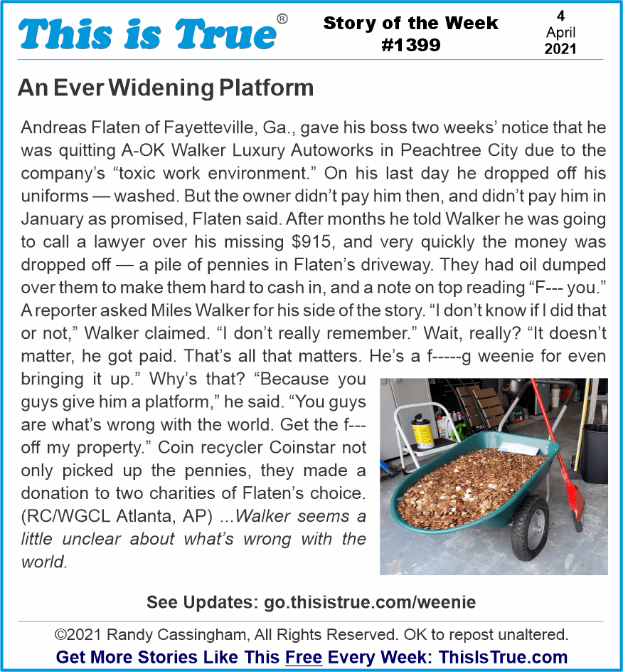 When we last heard from Miles Walker, the owner of A-OK Walker Luxury Autoworks in Peachtree City, Ga., who grudgingly paid employee Andreas Flaten his final wages by dumping 91,515 oiled pennies in Flaten’s driveway, the U.S. Department of Labor had filed a federal lawsuit against him, charging retaliation. (See “An Ever Widening Platform” in This is True for 4 April 2021 and “A Penny Saved” from 9 January 2022.) Not surprisingly, Walker lost in court, and has been ordered to pay nine former employees $39,934 in back wages and damages. Flaten will receive $8,690 of that amount. In addition, Walker was ordered to remove any photographs and references to Flaten and other current or former employees on his web site, and to never post any more there “or any other website or social media site.” Perhaps even better, Walker must post the judgment “immediately in all conspicuous places in its facility where employee notices are usually posted,” and “Conspicuously display a division fact sheet on prohibiting retaliation under the [Fair Labor Standards Act].” (RC/Macon Telegraph, WAGA Atlanta) …OK, taking bets: NOW does Walker get it?
