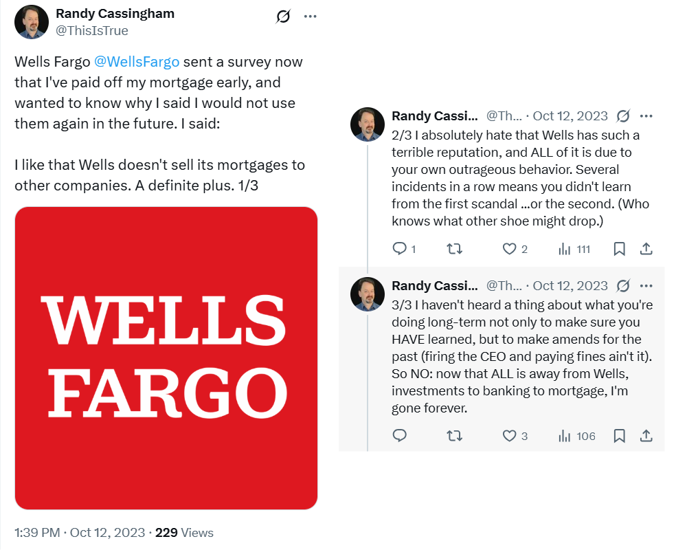 Sure enough, the same day I posted this, another Wells Fargo story came to my attention, and ended up in the next week’s newsletter: